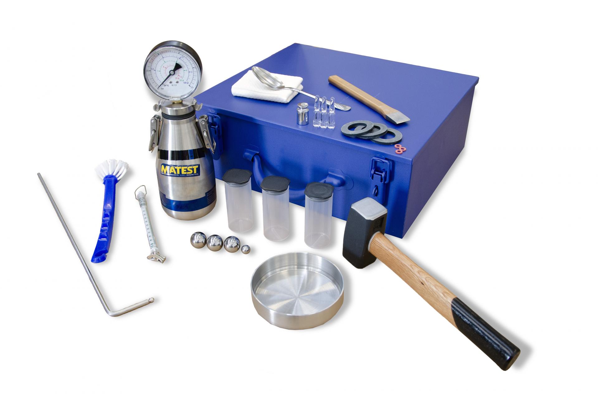 The bottle is calibrated and equipped with a surface thermometer. The glass ampoule containing the calcium carbide is broken when the bottle is closed and shaken, granting better accuracy to the test. The instrument comprises the testing bottle with a manometer, small balance, accessories, and case but without ampoules that have to be ordered separately.