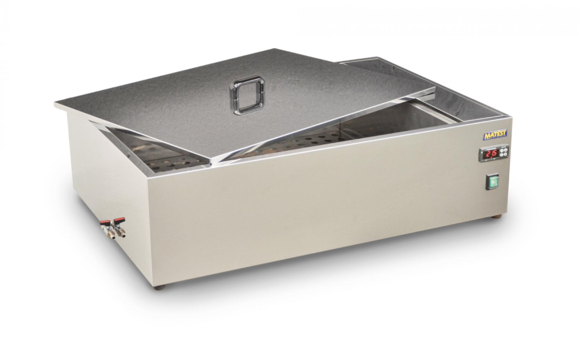The specimens are held by a shelf spaced out from the bottom. Complete with a digital thermostat and an electric stirrer for continuous water recirculation, ensuring a constant and uniform temperature of 60 ± 1°C or 37,8 ± 1°C as prescribed by the Standards. The bath can hold up to 20 Marshall specimens.