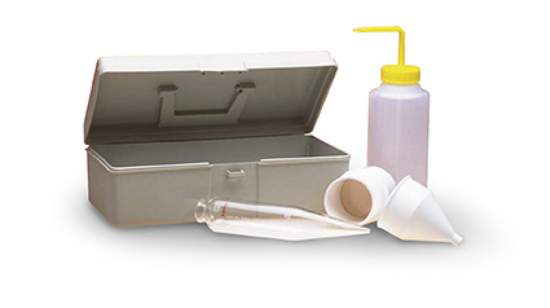 The collar and funnel are made of polyethylene and the screen is made of brass. A 500 ml wash bottle and carrying case are included.