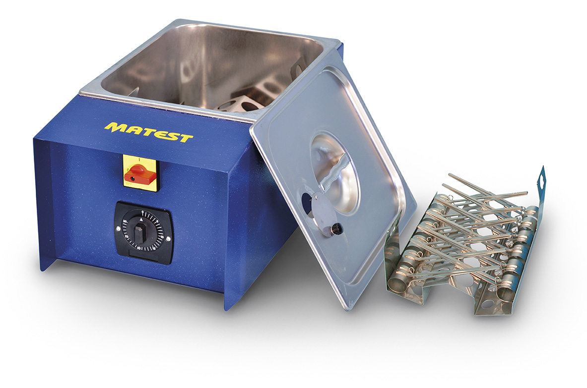 Constructed with stainless steel inside chamber and exterior case in painted steel sheet, it can hold up to 12 Le Chatelier moulds (to be ordered separately) in the removable rack, supplied with the bath.