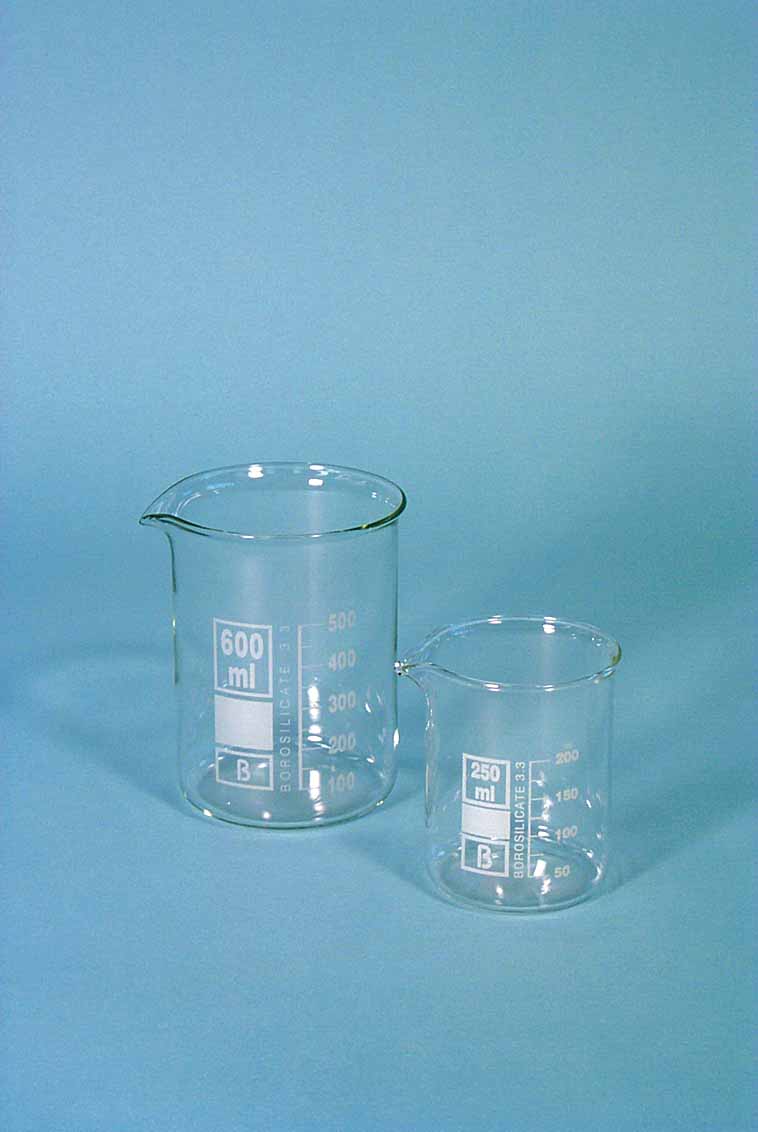 Beakers with spout made of pyrex glass. Squat form. Different capacities are available: