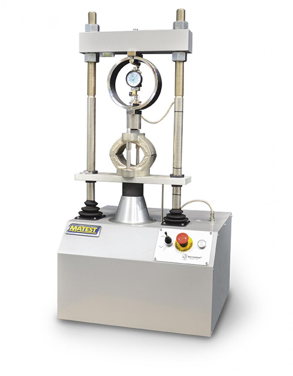 The applied load is measured by a proving ring 30 kN, supplied with calibration certificate. An electrical device is included to stop automatically the machine when reaching the maximum load capacity, in order to prevent damages caused by overload.