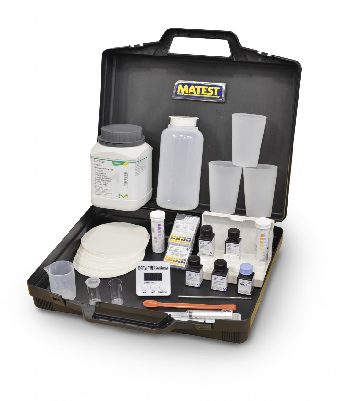 Compact laboratory for the determination of nitrate-, nitrite-, and ammonium-nitrogen as well as pH in soils. Formed by different bottles, reagents and accessories to perform about 50 tests for each soil factor.
