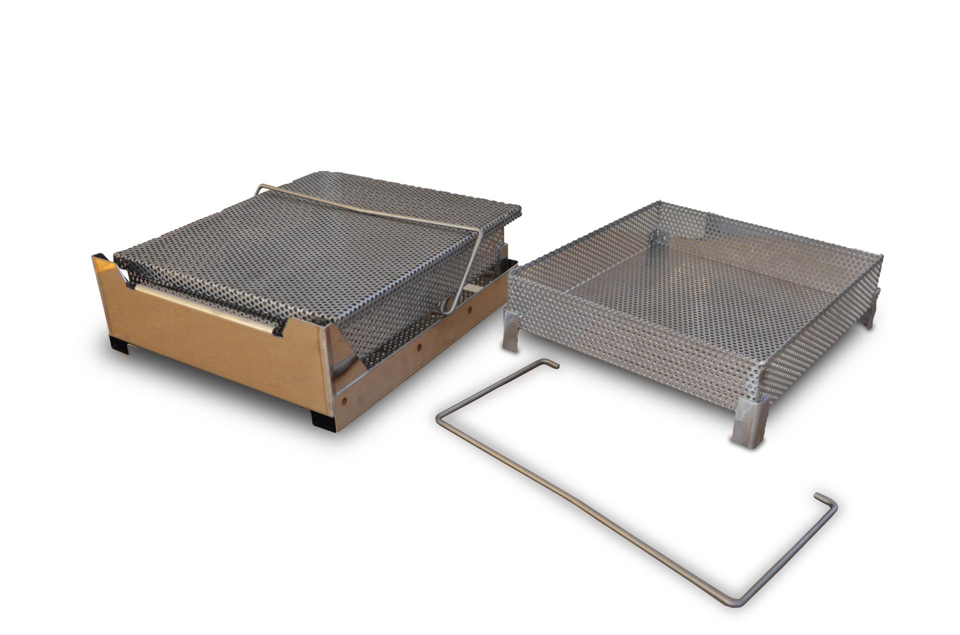 Two sample baskets, one lid, two handles and one welded metal container base.